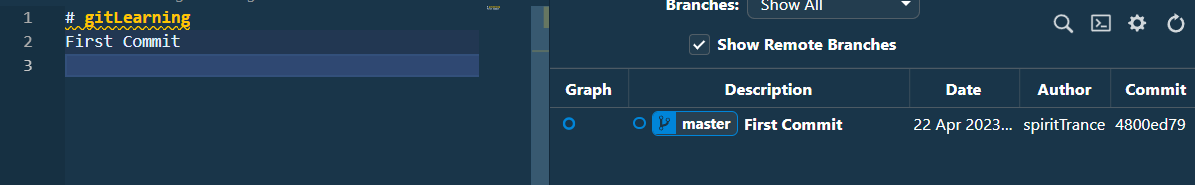 首先,我们创建好一个文档后,使用add指令和commit指令,提交刚创建的文档。右边的Git Graph就显示了当前的提交记录。