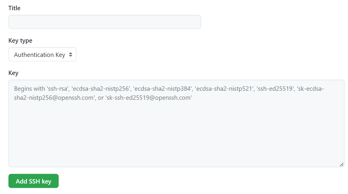 之后连续敲击三次回车键后会生成两个隐藏文件,在windows11环境下(其他环境需要留意cmd的提示)放置在该路径:C:\Users\<你的电脑用户名>\.ssh,在.ssh下找到 id_rsa.pub文件,复制里面的内容。然后登录托管平台,进入设置项目,在侧边栏找到SSH and GPG keys,添加SSH key,在Key里面粘贴 id_rsa.pub文件里的内容,Title内容可以随意填写。