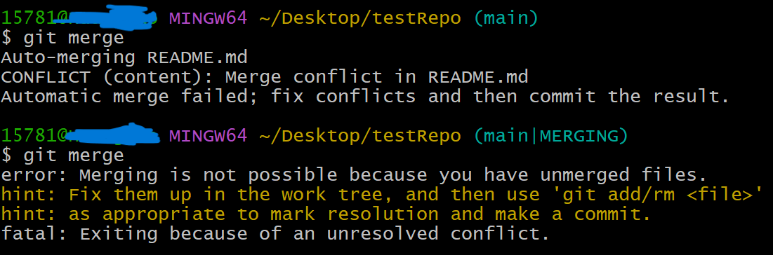 但如果在创建分支后,在两个分支上都对同一个文件进行了修改,那么对应文件会标出冲突部分,按照提示修改,然后重新add,commit,merge即可。